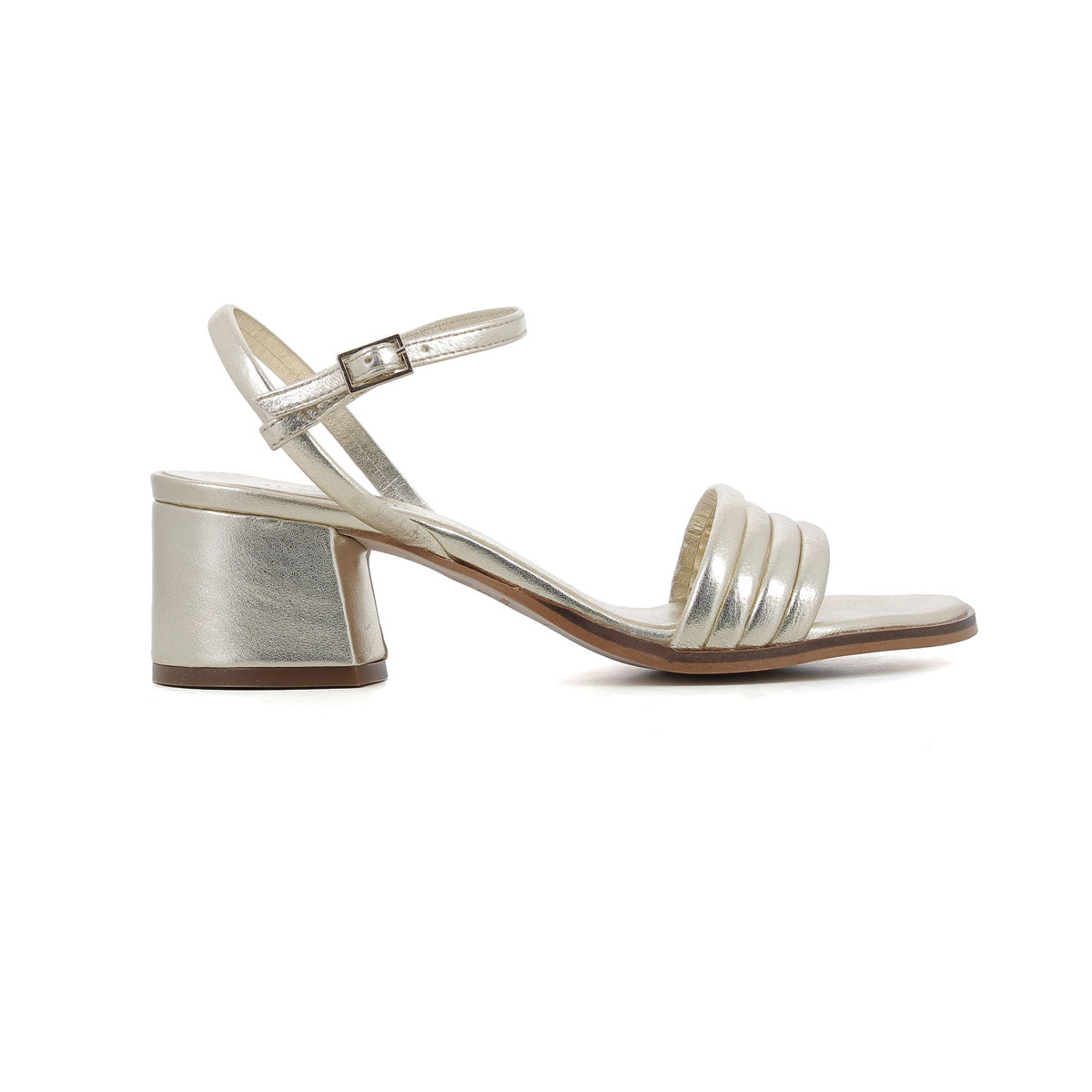 Sandalia dorada de tacón cuadrado con atadura al tobillo. Tiras en el empeine y tacón ancho, ideales para combinar con tus vestidos más especiales.